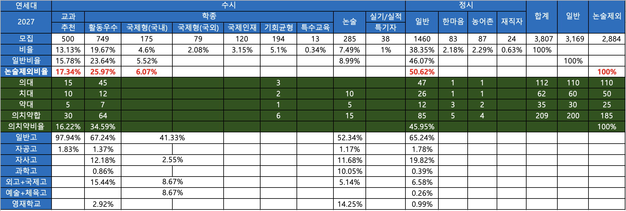 연대 2027 전형계획 특징 - 일반 학생이 가능한 전형 위주(기회균형 제외, 논술 제외)